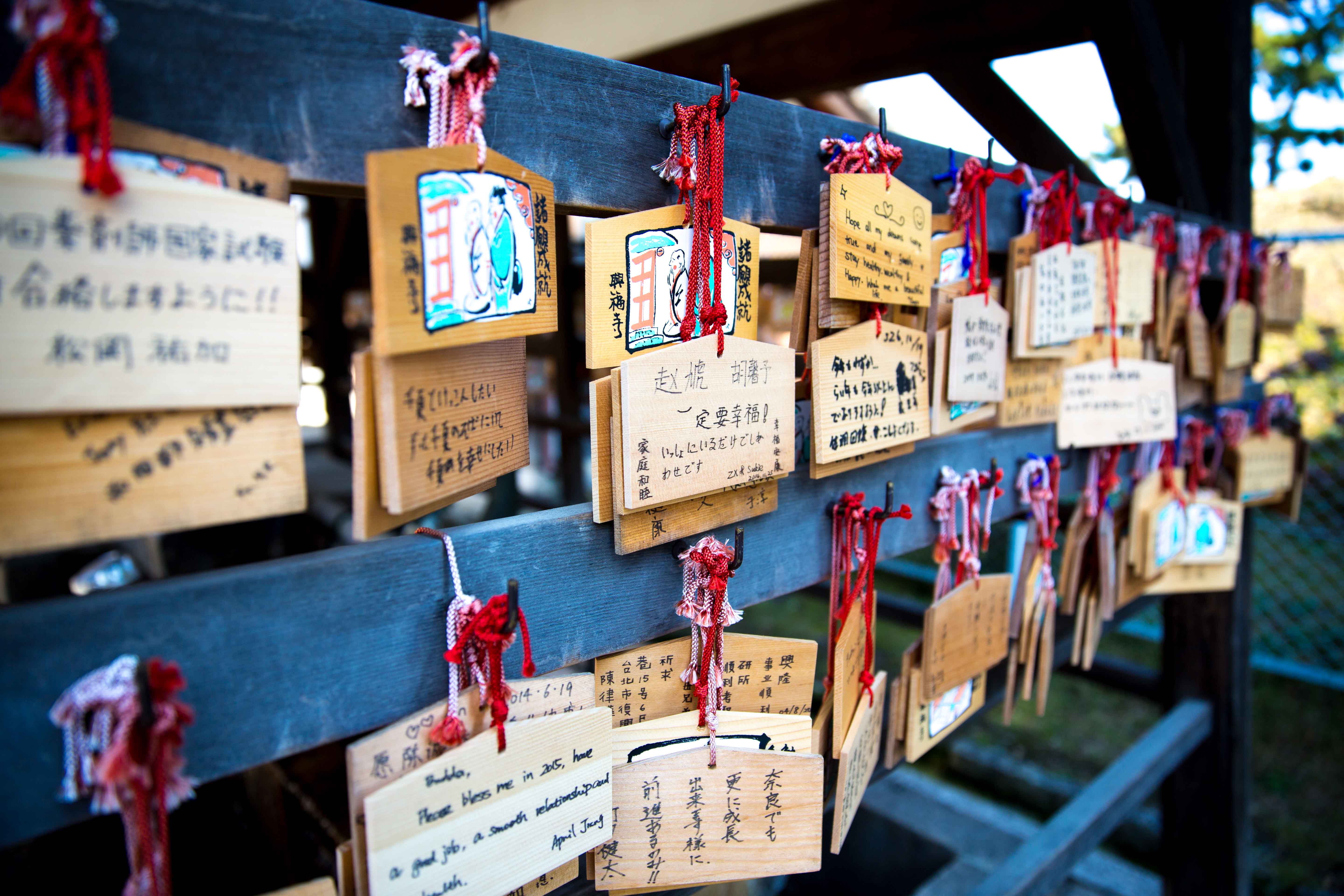 People wrote their wishes and blessing on these wooden plate and hang in the Shrine