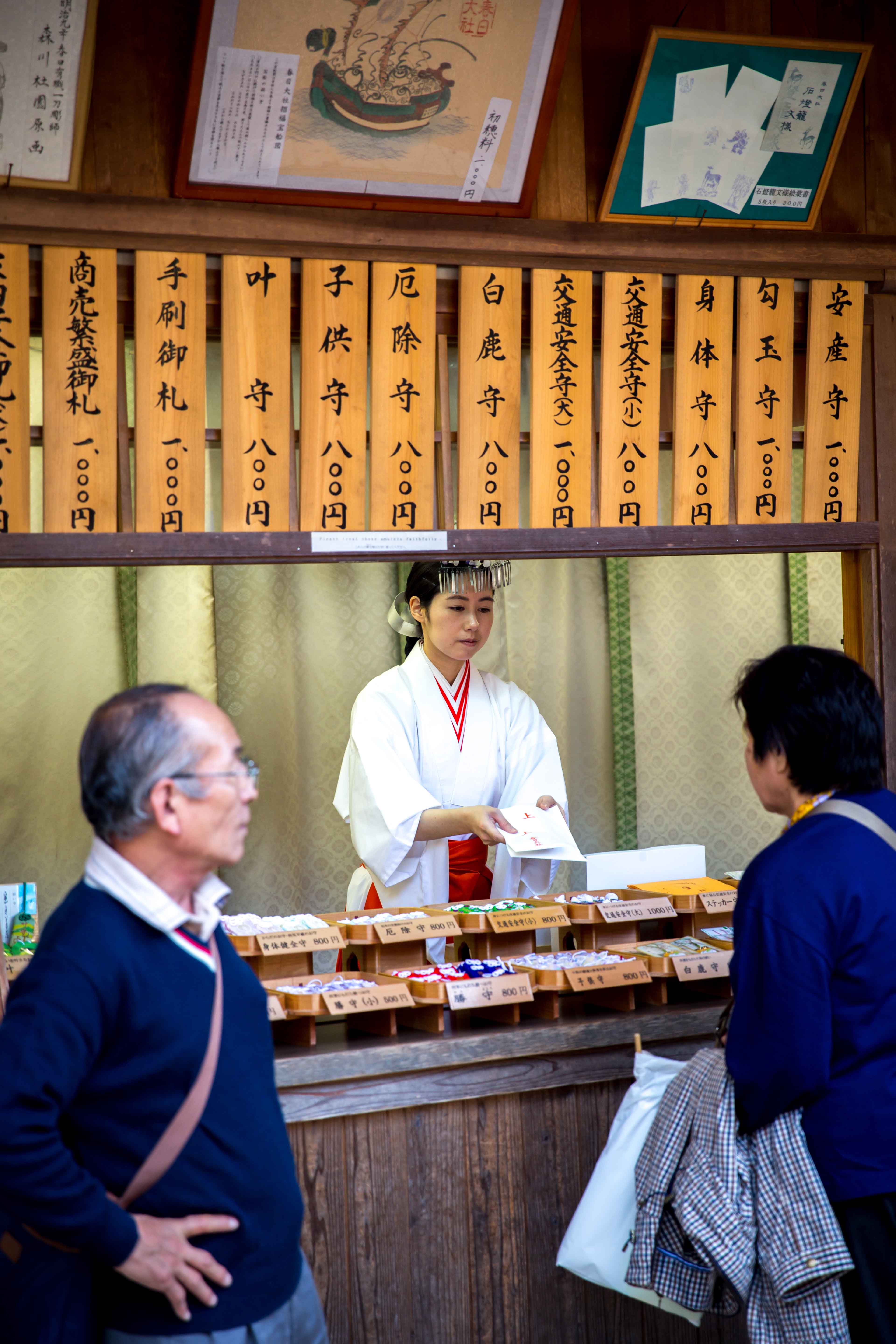 Selling different Omamori (Japanese amulets (charms, talismans) commonly sold at religious sites and dedicated to particular Shinto deities as well as Buddhist figures, and may serve to provide various forms of luck or protection.)