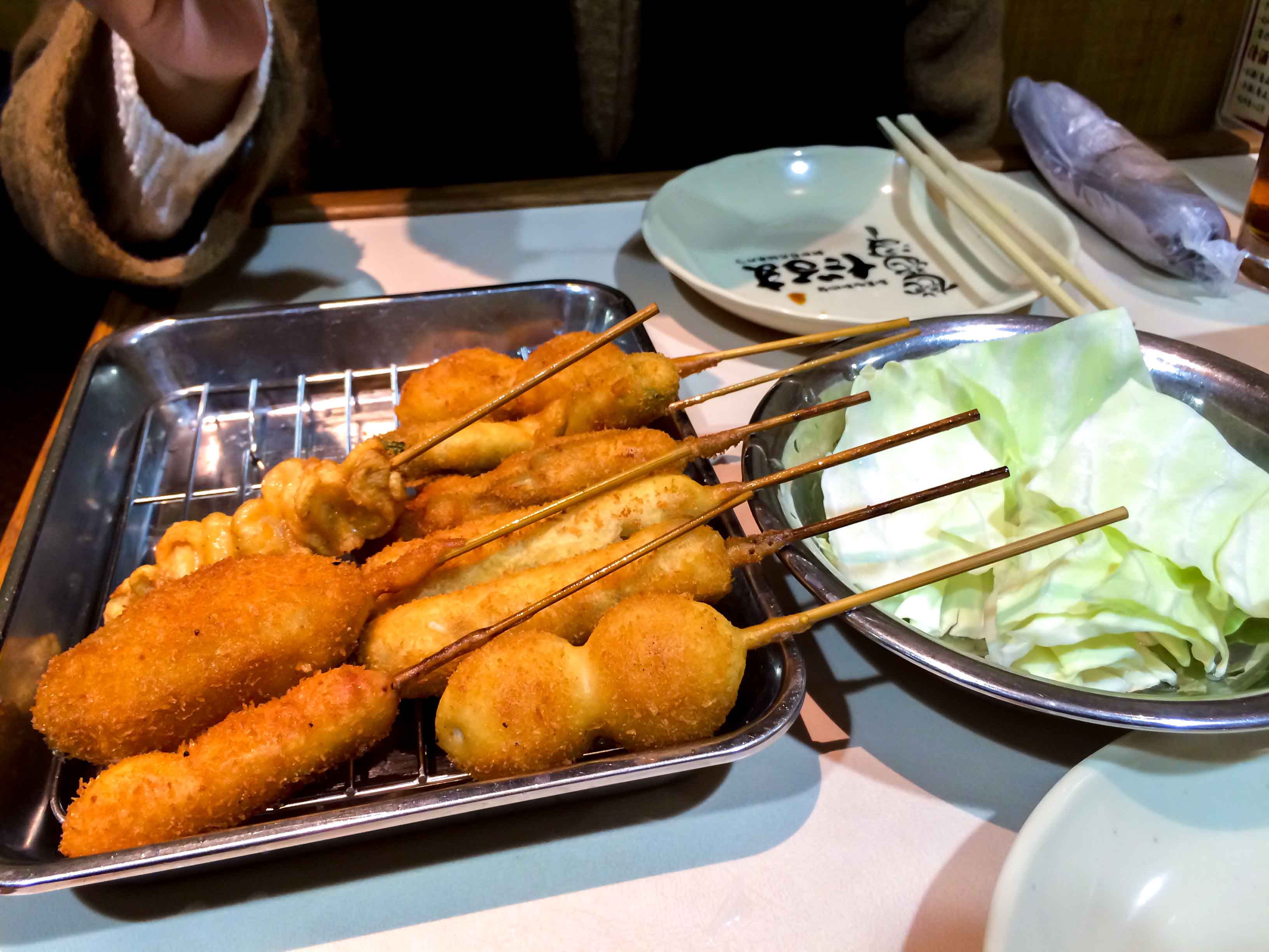 Theres quail egg, beef, octopus, eggplant, oyster etc. Cost around 120 Yen – 300 Yen per stick depend on what you order. The cabbage is free.